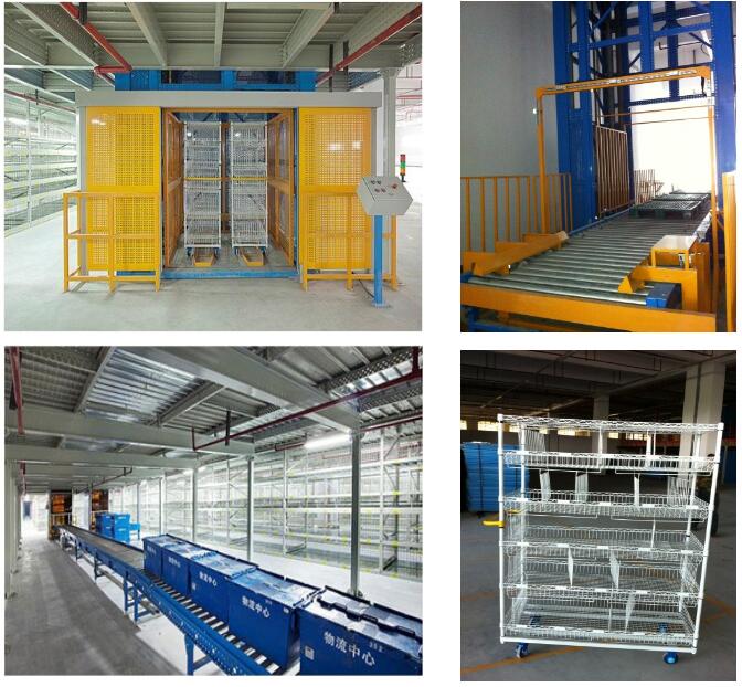 5套拣选车提升机,完成阁楼货架一层到夹层间的输送,采用双车位设计及联动互锁电梯门技术,确保输送的安全性;