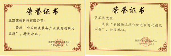 北京伍强科技有限公司总经理尹军琪等12位行业领袖荣获2014中国物流现代化进程时代模范人物大奖,伍强科技还荣获2014中国物流装备产业最具创新力品牌。这是一项具有广泛权威的评奖。再一次表明伍强科技在我国物流技术与装备领域所取得成就已经为行业广大用户和同行认可,这是对伍强科技的巨大鞭策和鼓励。