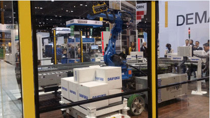 本届展会给人的一个最突出的印象是:高度自动化和智能化的时代已经来临。我们一行当中,有起重、运输、仓储等多个领域的成员,大家各有各自的重点,也各有各的兴趣,但有一点是共同的,就是都对参观机器人展怀有浓厚的兴趣。 不仅在PROMAT上有机器人,如大福展出了机器人自动从AGV上抓取箱子的技术,德马泰克则展出机器人自动拣选物料的技术,还有很多单位展出了机器人码垛和拆垛,机器人自动挂箱,以及多种识别模式的医院用AGV系统等技术。