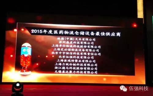 在晚宴上,由中国医药供应链联盟举办的2015年度医药物流系列评选活动获奖名单公布,伍强科技荣获“2015年度医药物流仓储设备最佳供应商”奖,伍强科技副总裁、市场部总经理、销售总监渠晓通先生荣获“2015医药物流年度风云人物”。
